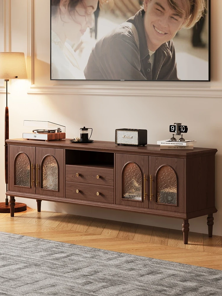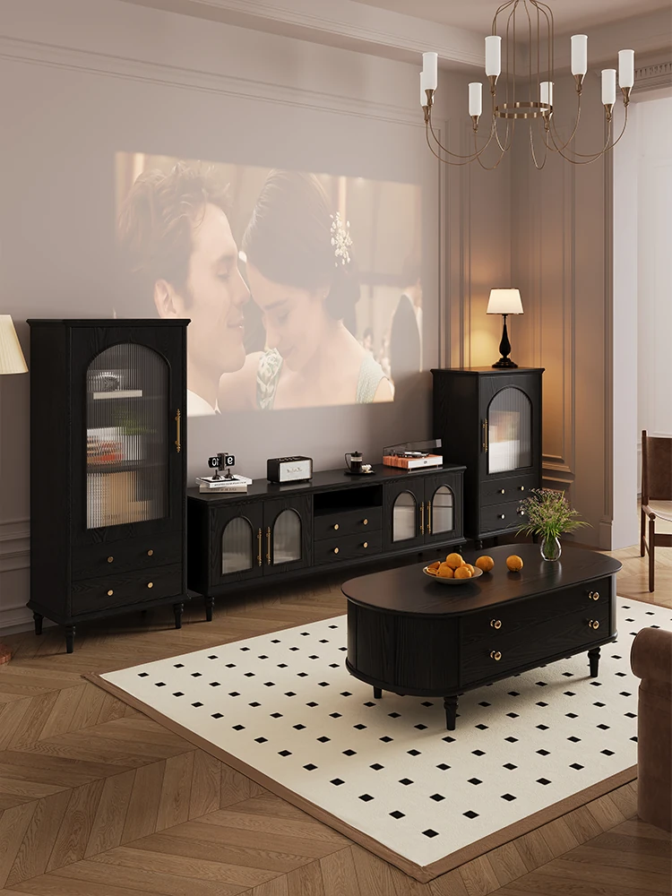 フレンチヴィンテージの高級感あふれる実木テレビボード&コーヒーテーブルセット、モダンなブラックデザインのガラステレビキャビネットで、リビングに洗練された雰囲気をプラス!