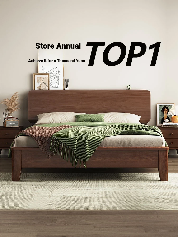 Nordic Solid Wood Bed - Modern Minimalist Design, 1.8m/1.5m Double Bed with High Storage Box in Walnut Finish, Perfect for Your Master Bedroom!