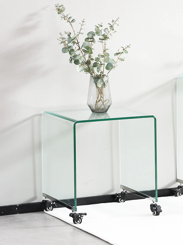 Modern Minimalist Movable Rolling Clear Glass Side Table – Designer Sofa End Table for Living Room, Perfect for Home Decor and Space-Saving Solutions