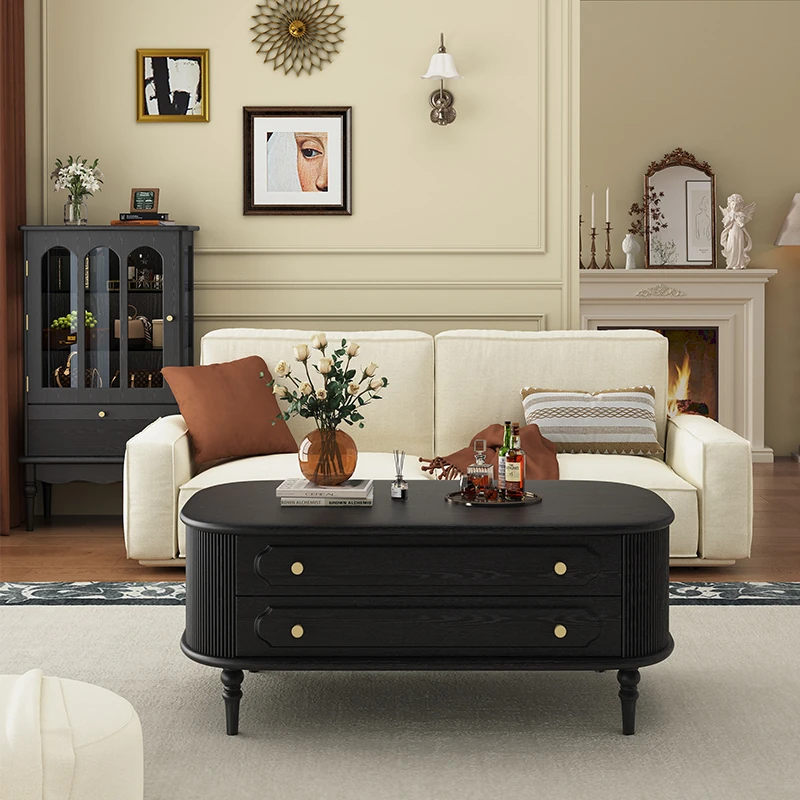 Vintage French-Style Solid Wood Coffee Table and TV Cabinet Set - Elegant Oval Mid-Century Tea Table for American Living Rooms, Perfect for Home Decor