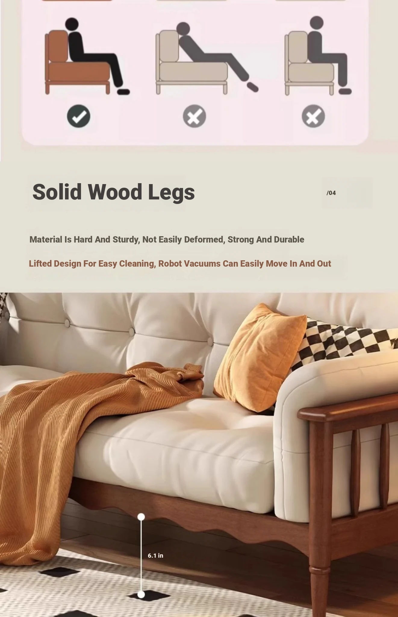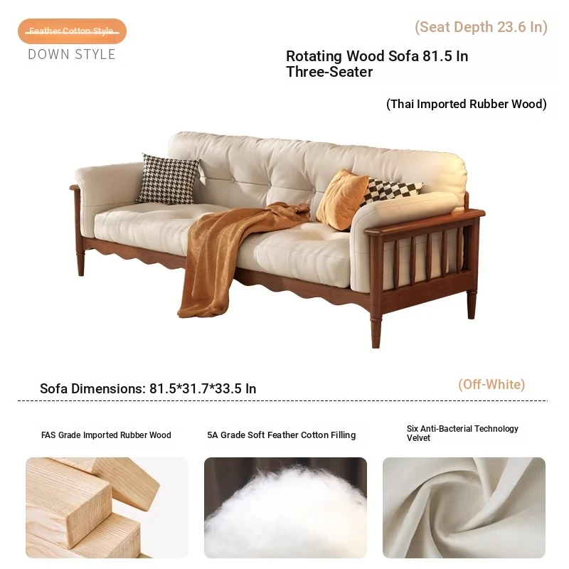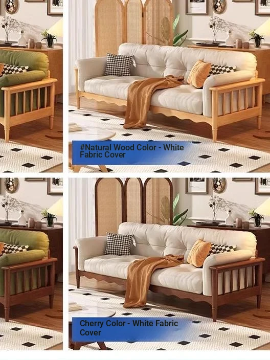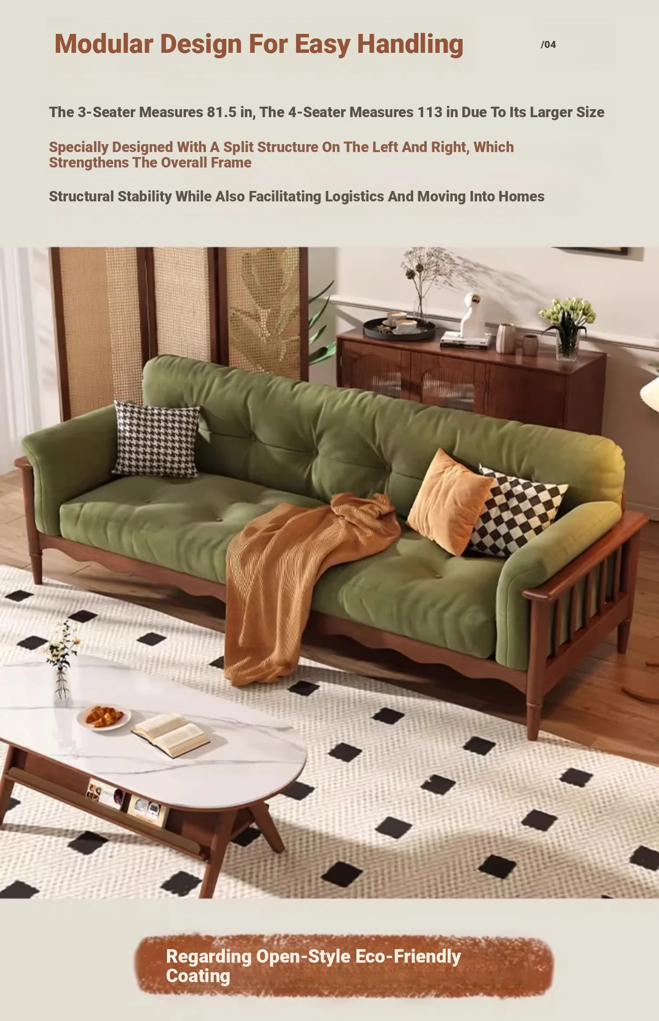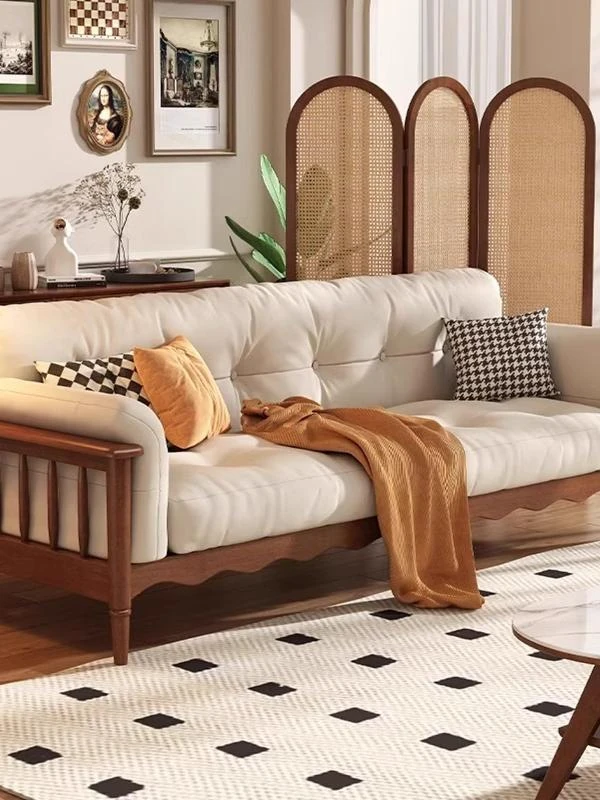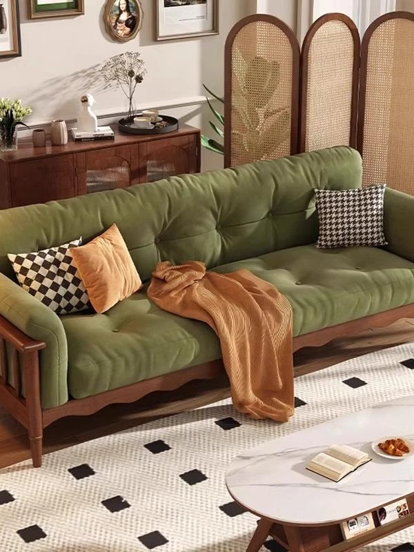 フランス風の無垢材ソファ、レトロスタイルの小型リビングに最適!冬も夏も快適に使える3人掛けの和風ヴィンテージ布製ソファ。おしゃれで機能的な空間を演出します。