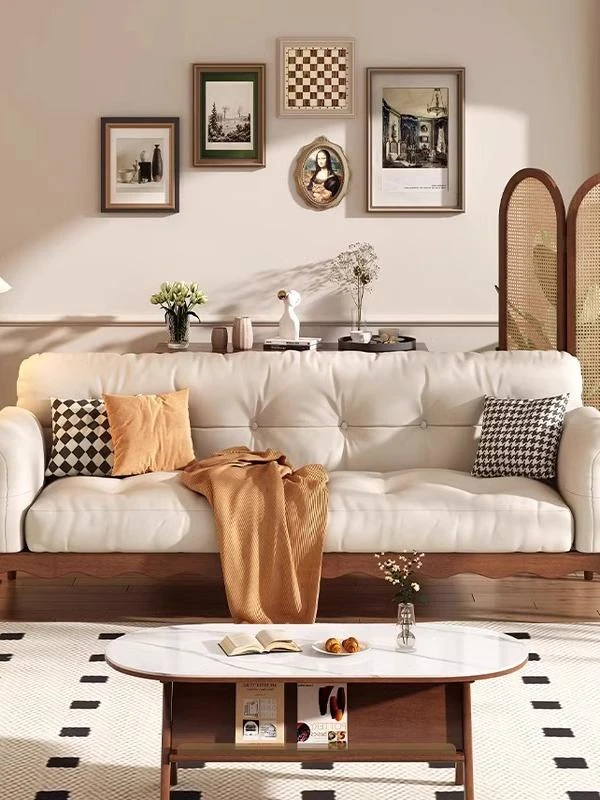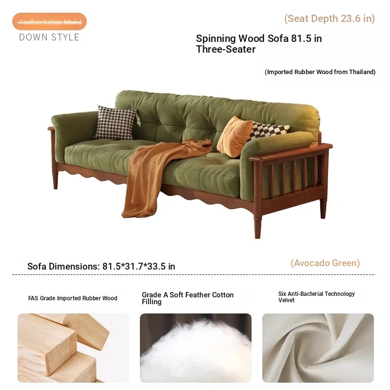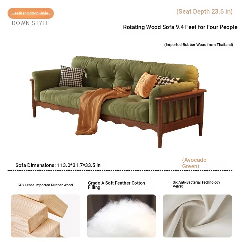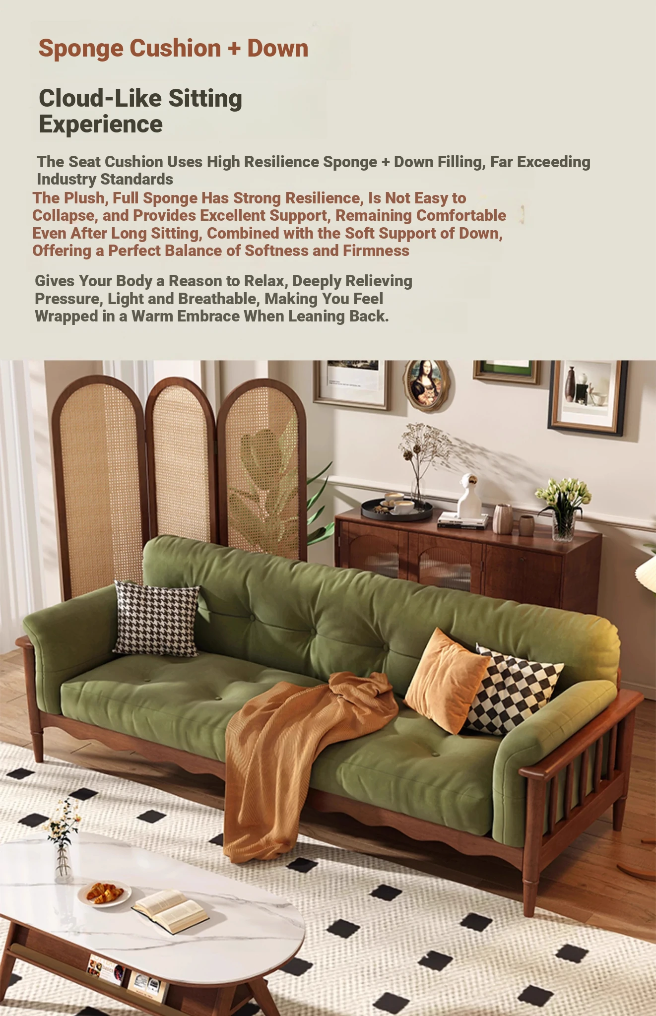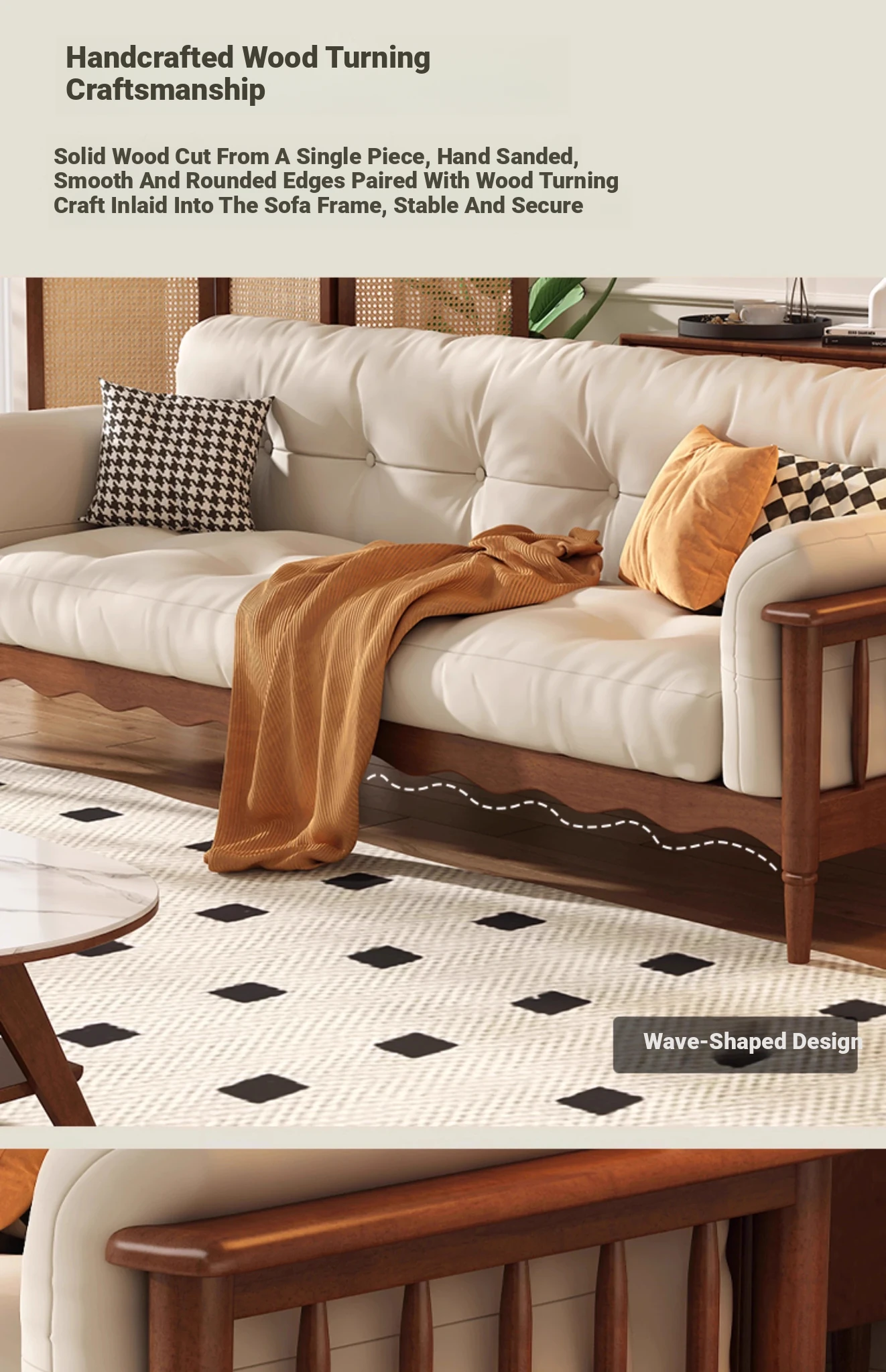 フランス風の無垢材ソファ、レトロスタイルの小型リビングに最適!冬も夏も快適に使える3人掛けの和風ヴィンテージ布製ソファ。おしゃれで機能的な空間を演出します。