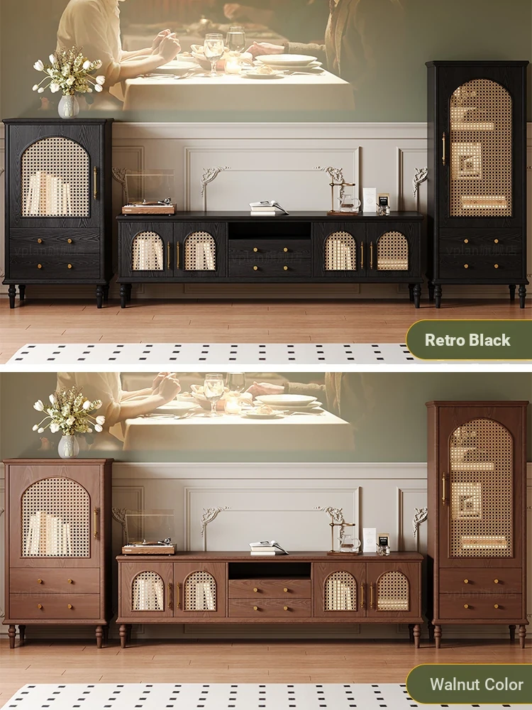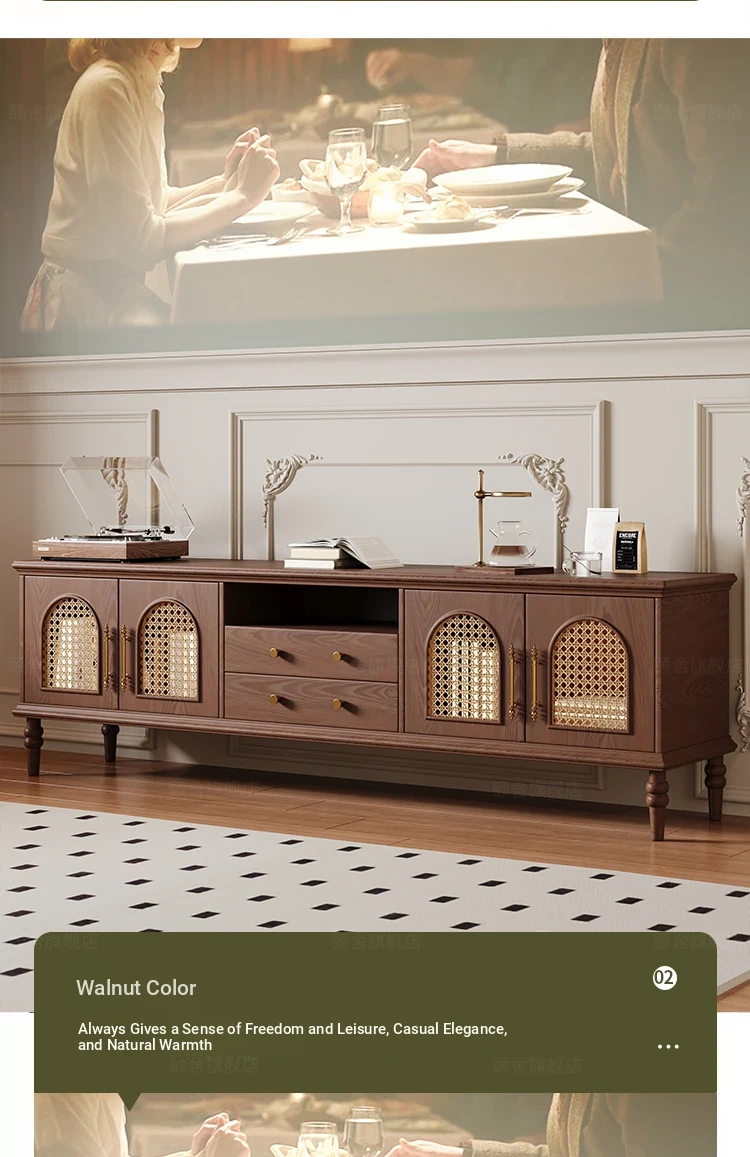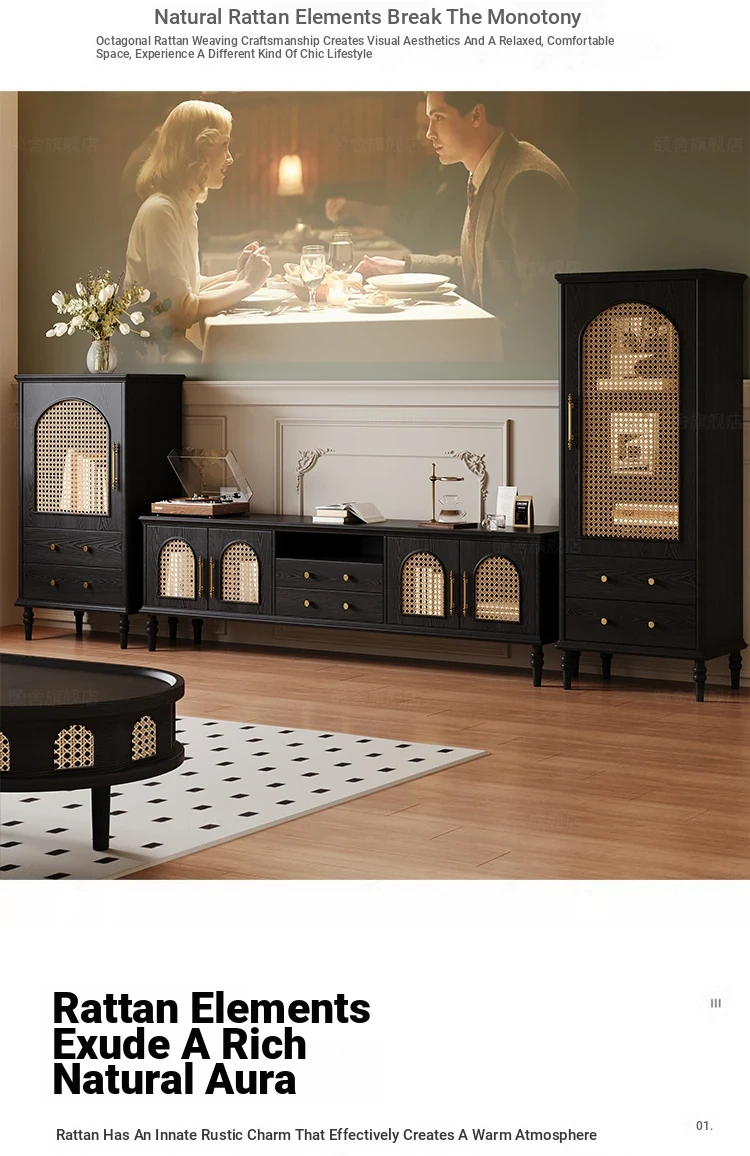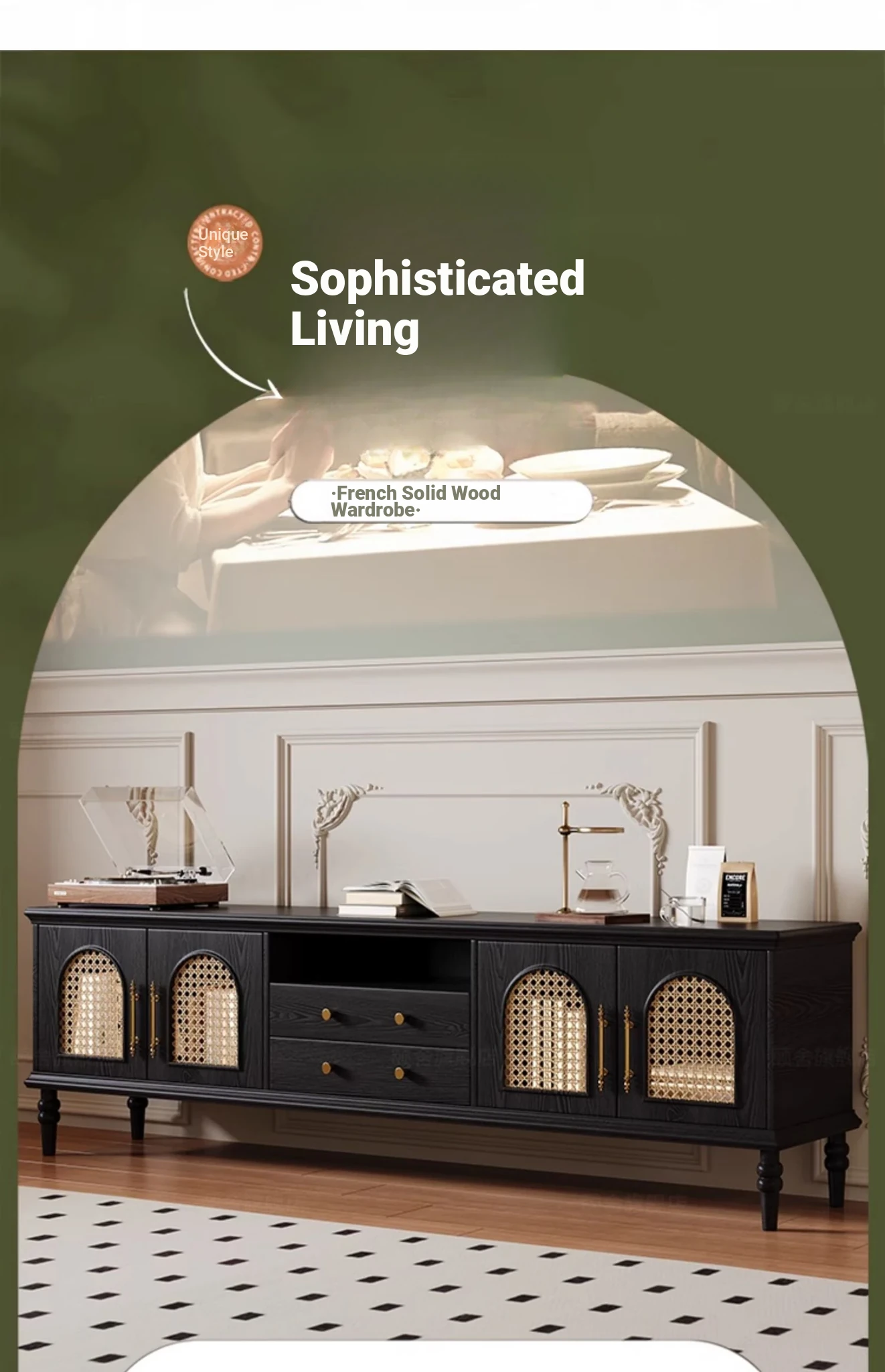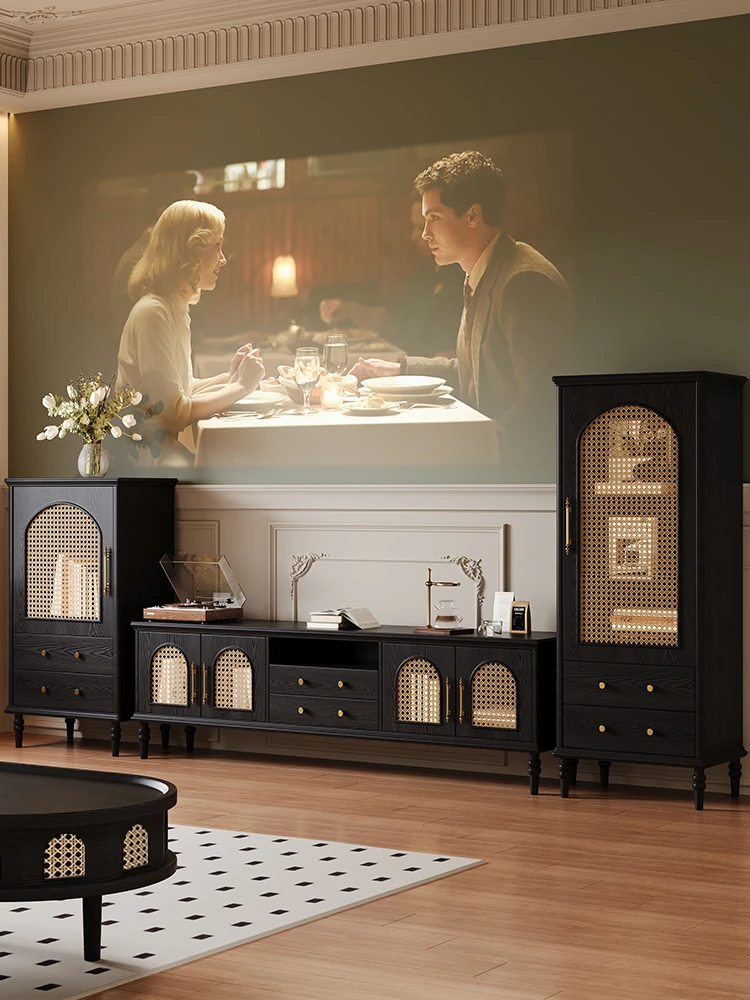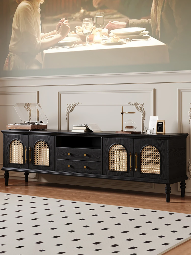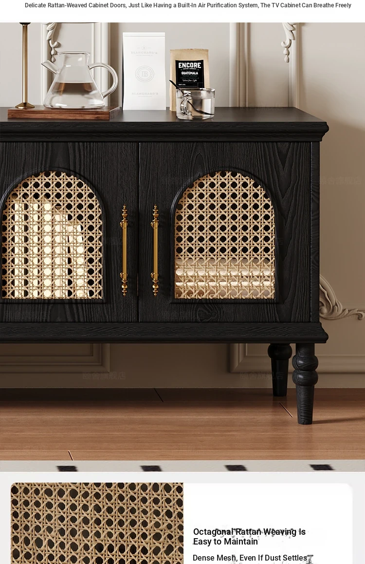 French Vintage Solid Wood TV Cabinet for Small Spaces - High Design Mid-Century Style Bedroom with Rattan TV Stand, Perfect for Chic Room Aesthetics.