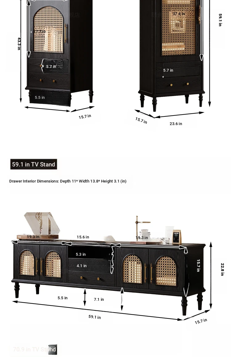 Solid Wood rattan TV cabinet 59.06 ins + high and low cabinet [black] Ten years warranty