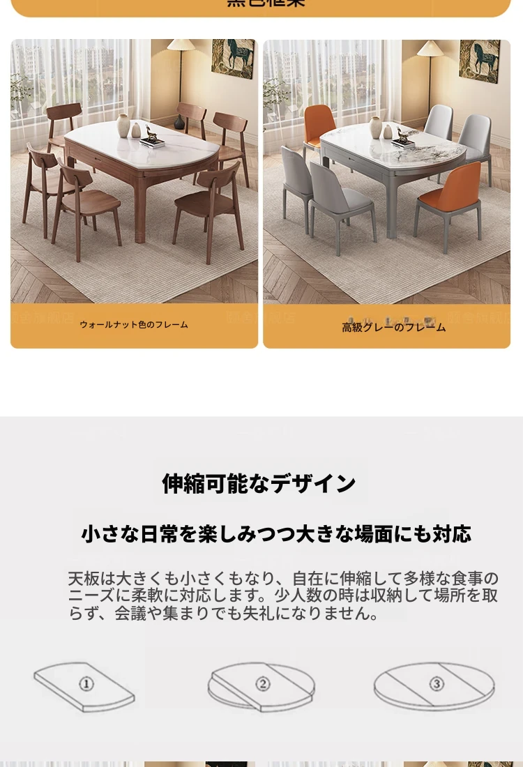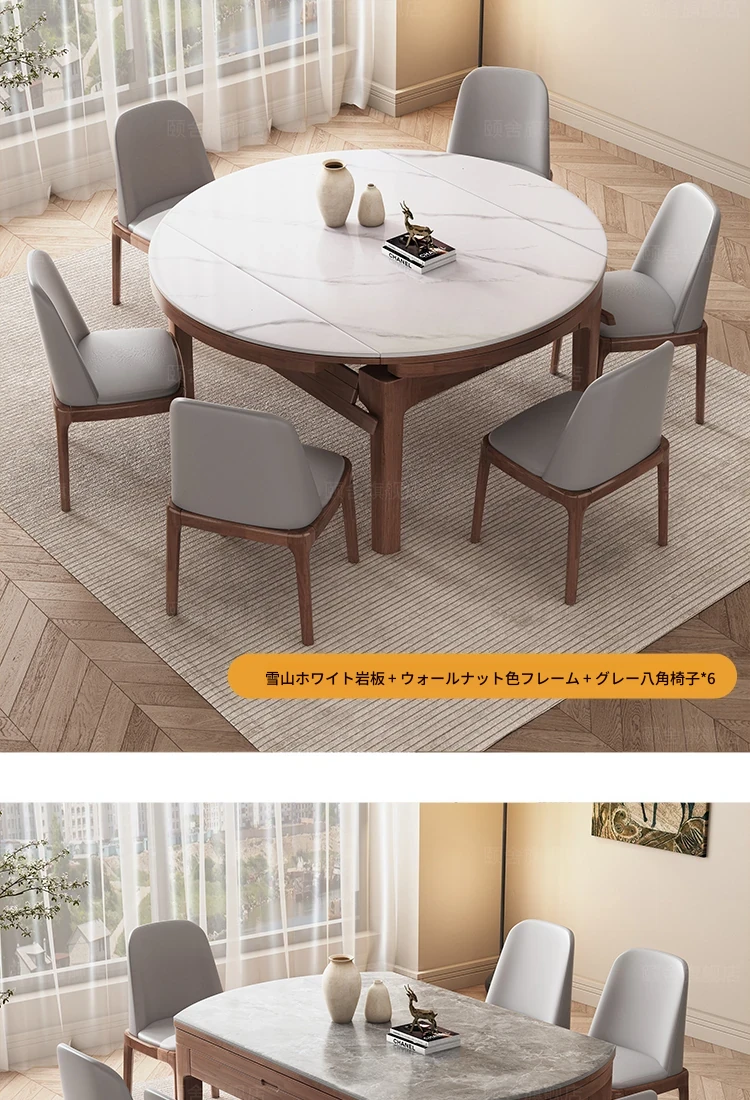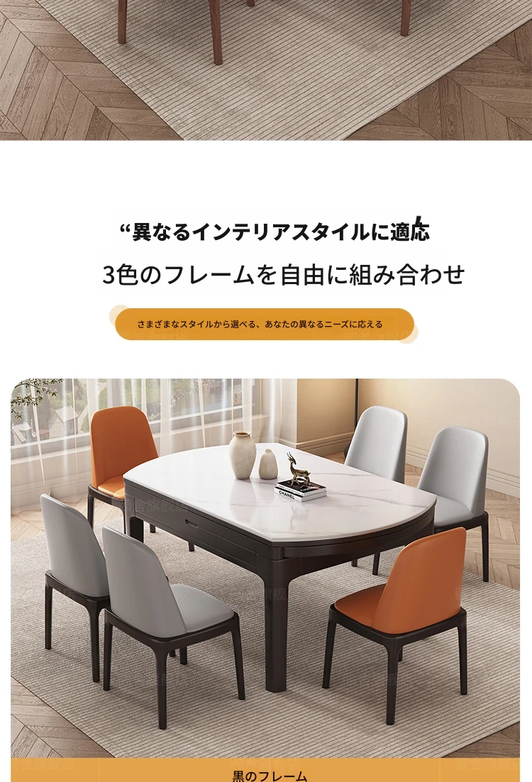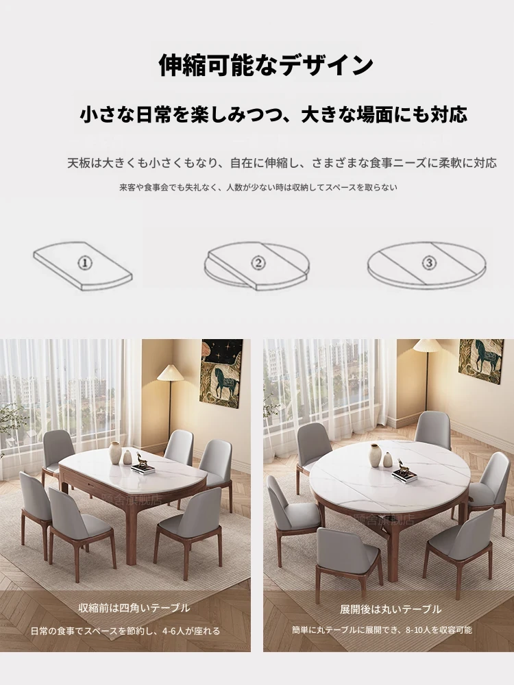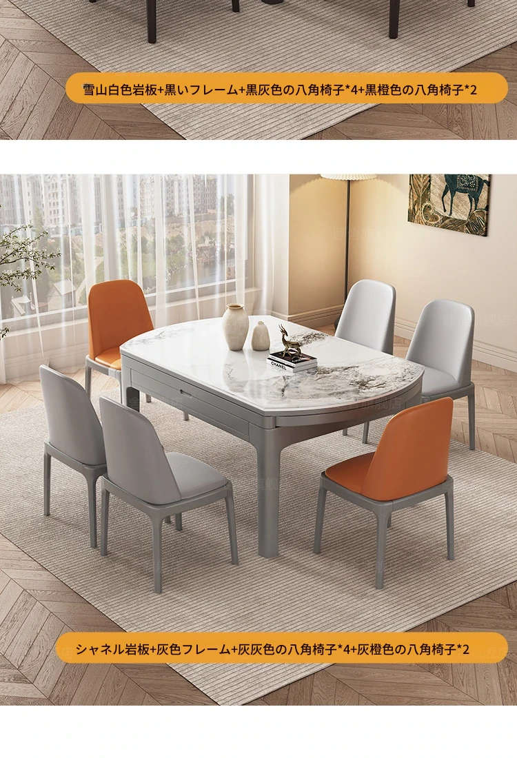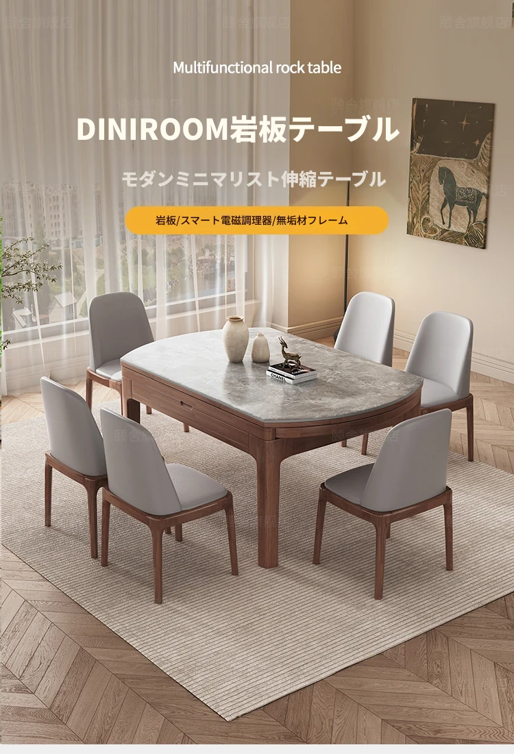 モダンでシンプルなデザインの岩板ダイニングテーブルと椅子のセット!軽奢な雰囲気を持ち、小さなスペースにもぴったり。伸縮可能で折りたたみ式の円形テーブルは、実用性とスタイルを兼ね備えています。家族や友人との特別なひとときを楽しむための完璧な選択です!