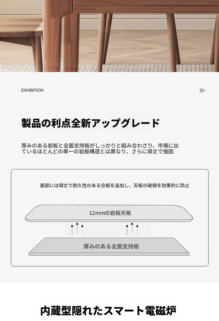 1.5メートル単テーブル+IHコンロ+6椅子【連続模様抗菌岩板/4本レール】